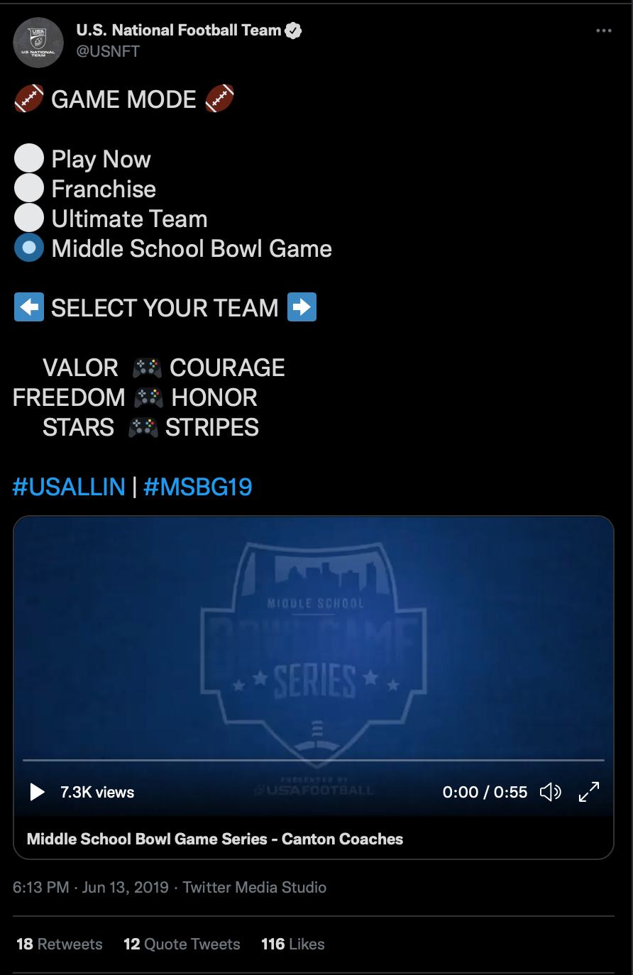 I created the motion graphics, captured and edited photos and video included in U.S. National Team Middle School Bowl Game (MSBG), High School Training Camp (HSTC), and International Bowl coverage. In addition to creating the graphics/multimedia content, I wrote the social media and communication plans including planning promotional content, created shot lists, schedules of live coverage.
